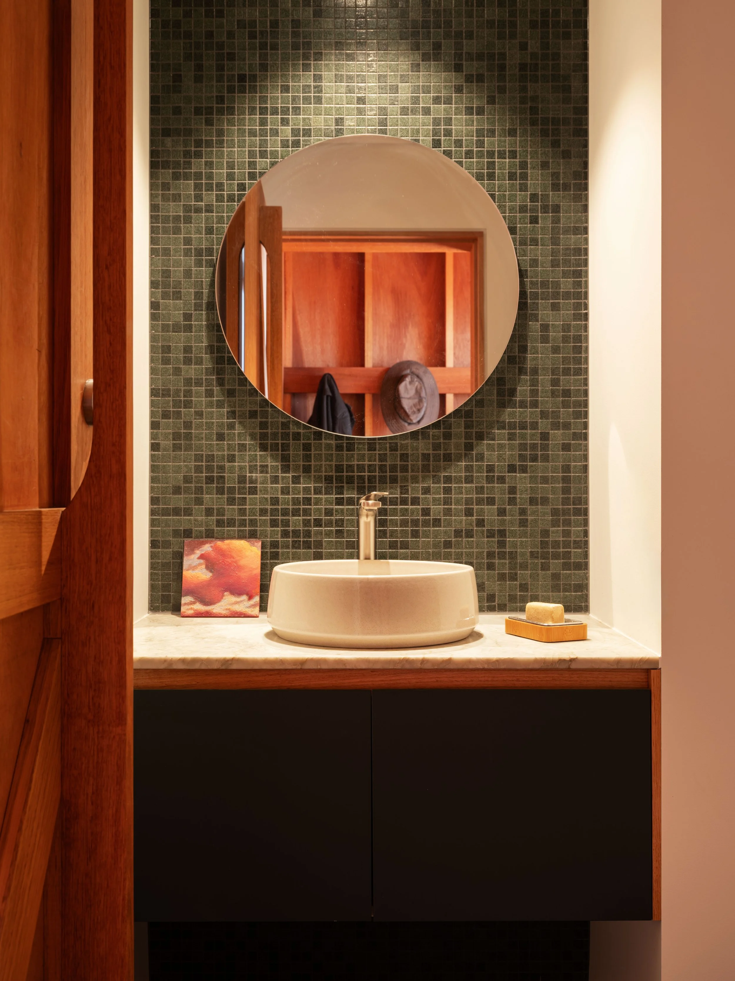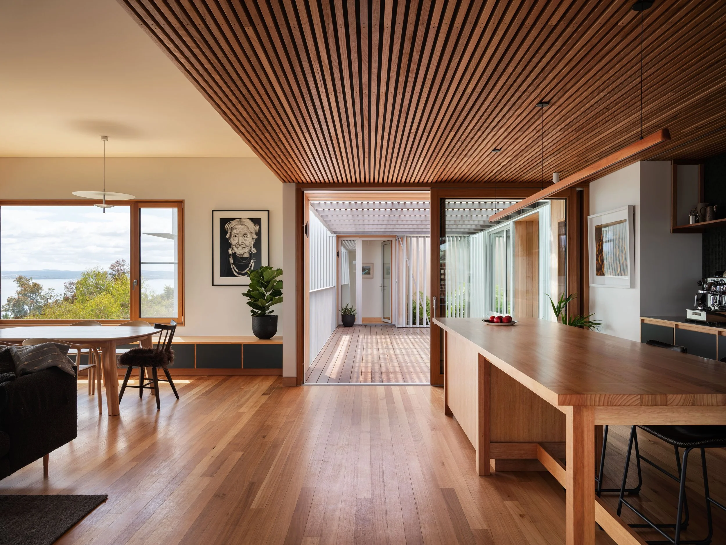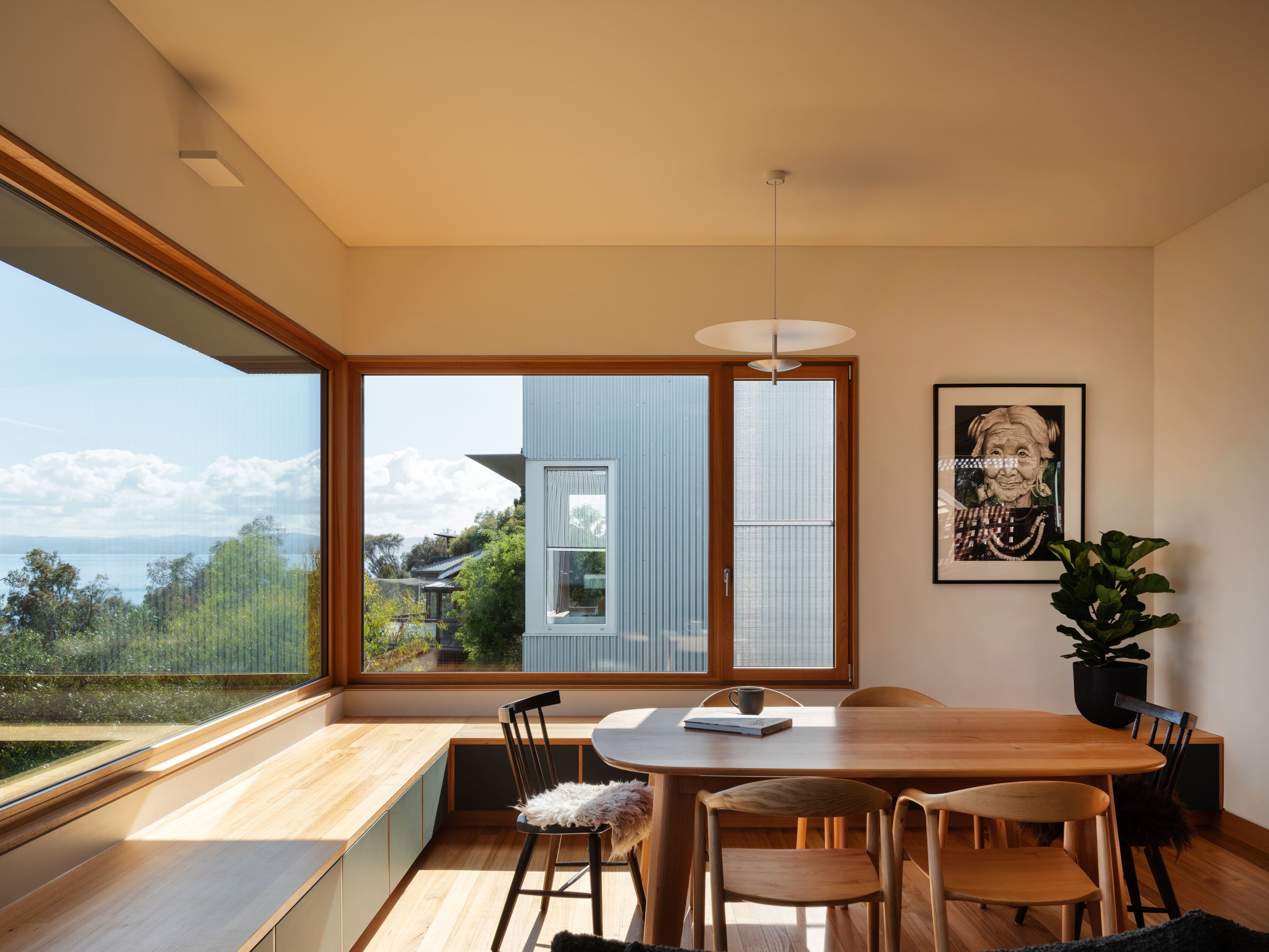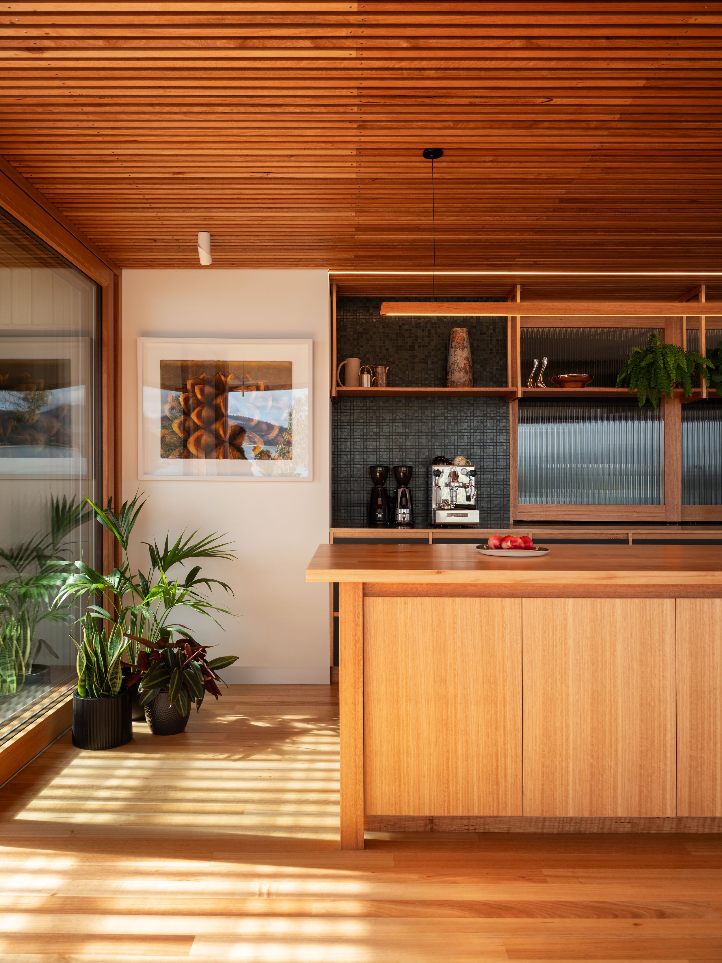 Craftsmanship and attention to detail shape how the home is experienced each day. A deliberately simple exterior allowed greater investment in the areas people live within — high-performance glazing, solid timber joinery, acoustic battened ceilings and carefully crafted linings that create warmth and comfort.