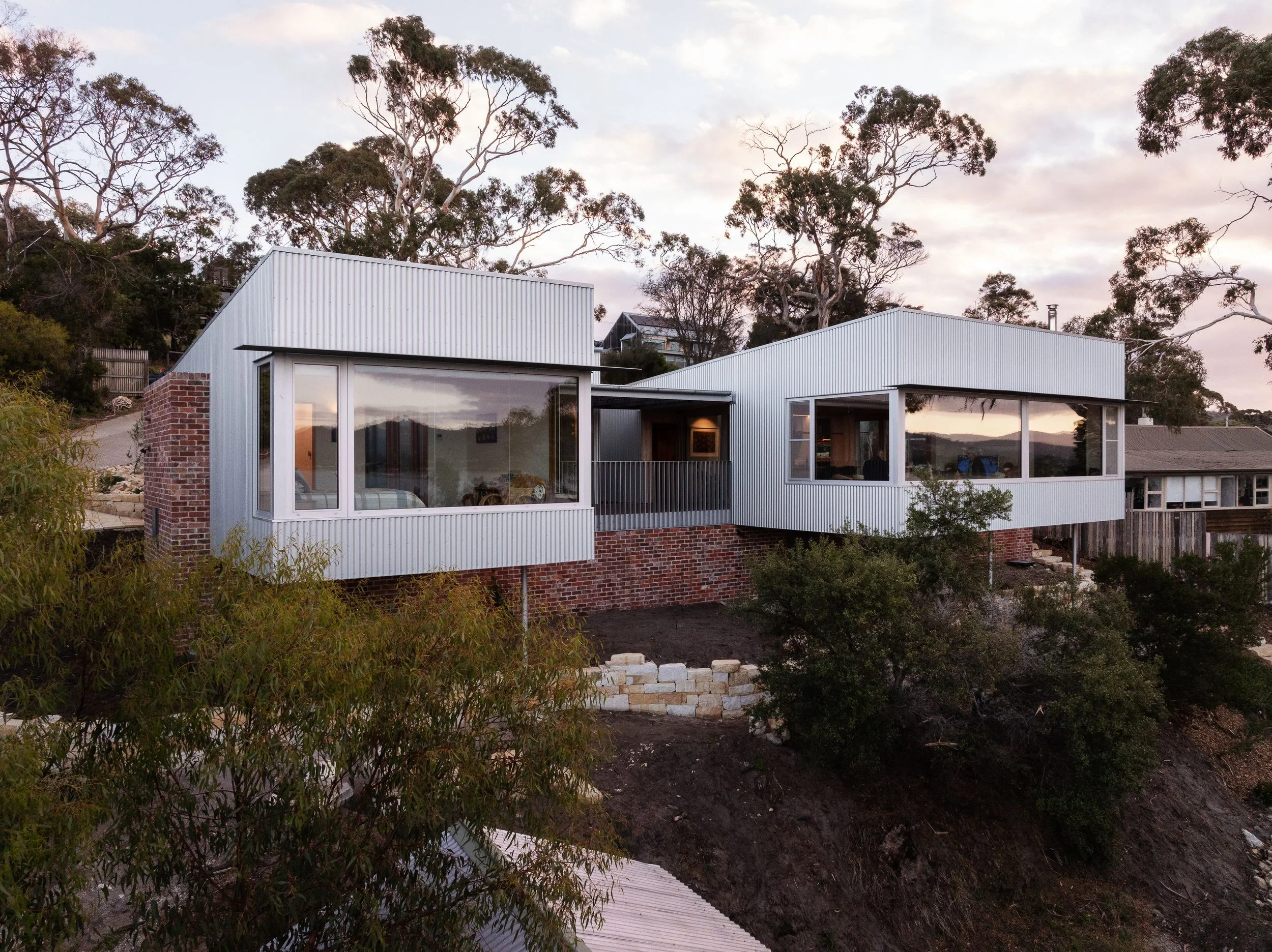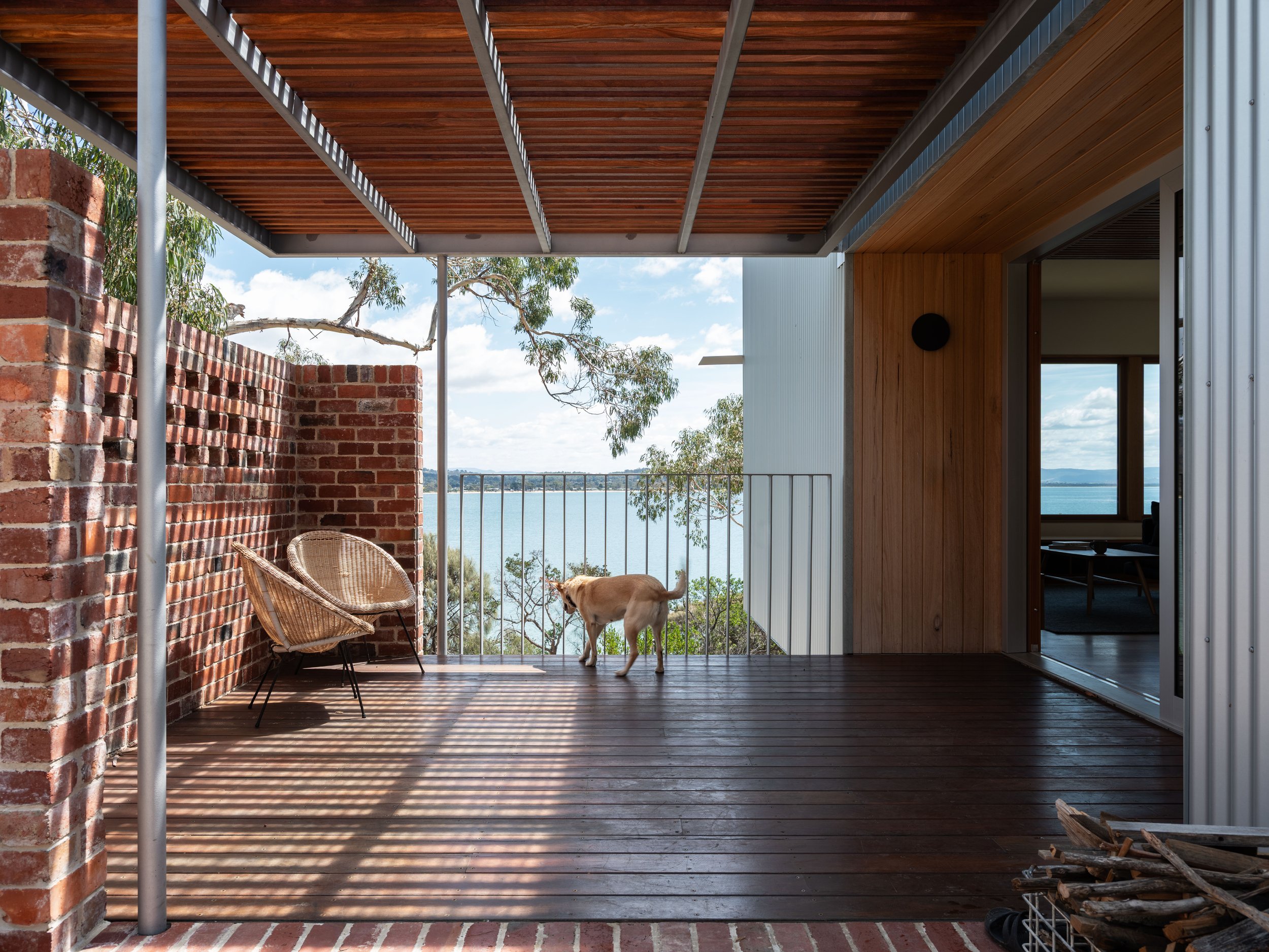 The pavilions gather around a protected north-facing verandah, where indoor and outdoor living overlap and everyday movement through the home feels relaxed and intuitive. Moving between rooms often means stepping outside, deepening awareness of weather, light and seasonal change. A plinth of reclaimed bricks, gathered by the family over many decades, anchors the architecture to its history, while lightweight timber and metal forms extend toward sunlight and views.