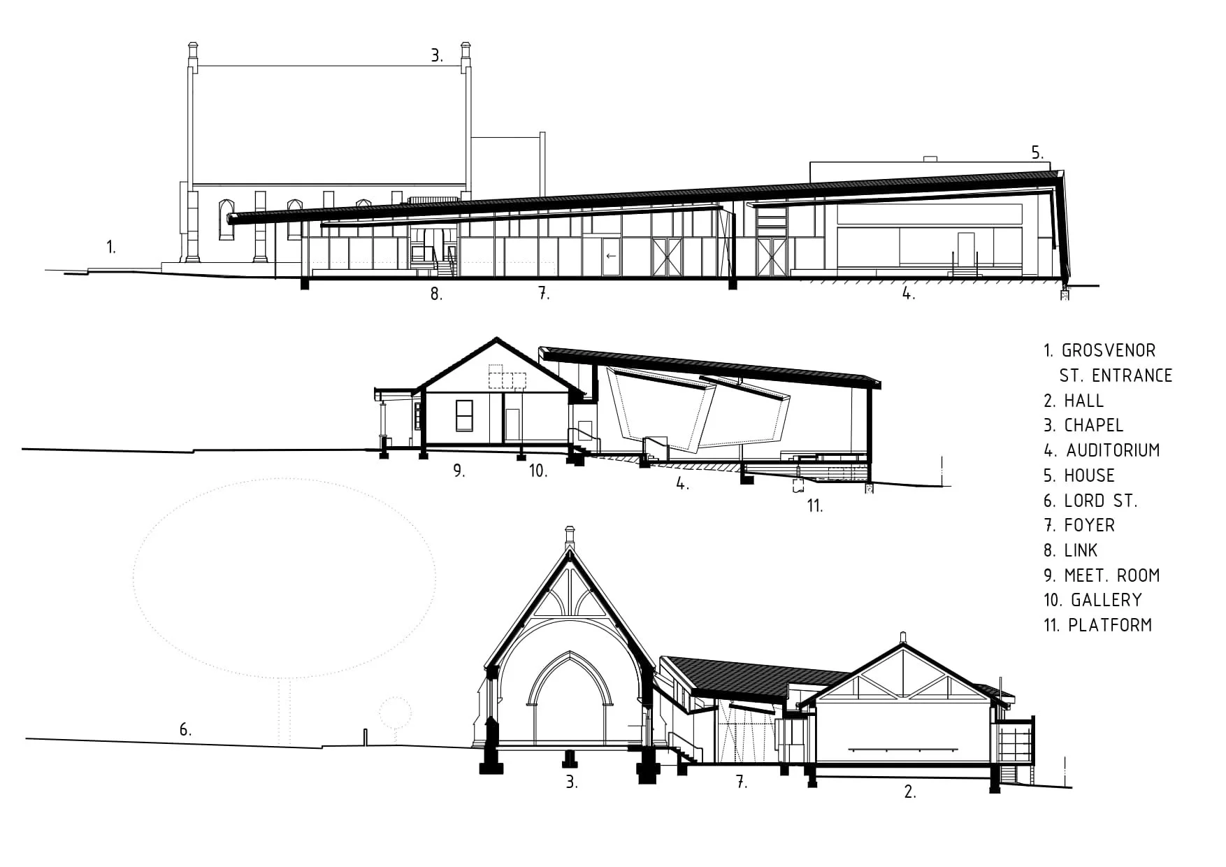 The new building rests in the spaces between the existing, linking all buildings under one light-filled canopy with an openness and transparency in keeping with the churches contemporary ethos. The form, scale and massing is intentionally subservient in relation to the existing buildings. It provides a range of community facilities including meeting and activity spaces, offices, commercial food premises and a new 270 seat auditorium to compliment the historic chapel. Spaces have been crafted to serve the users and their place in a contemporary manner while creating harmony with the significant heritage values of the existing buildings.